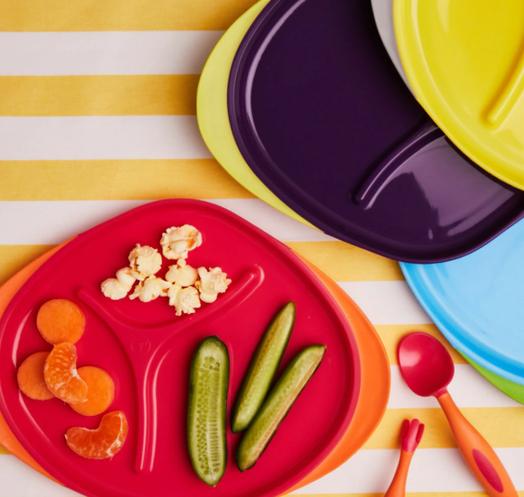 The ideal plate for fussy eaters and self-feeders. Our divided plate keeps food groups separate on the plate thanks to our subtle dividers. Easy grip tabs on side and non-slip base give kids greater control. Large surfaces and rim assist with self-feeding. Dishwasher and microwave safe.