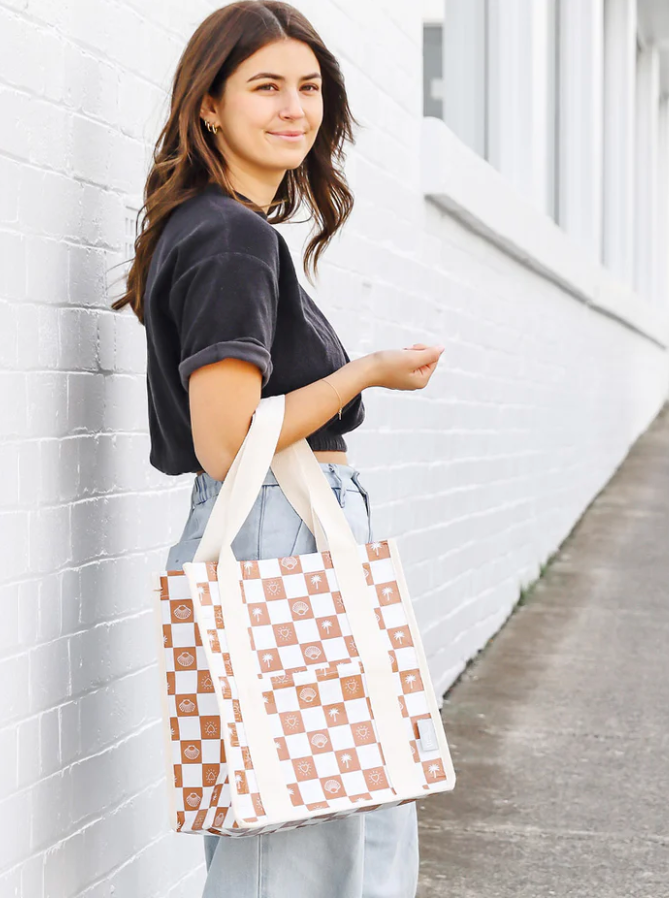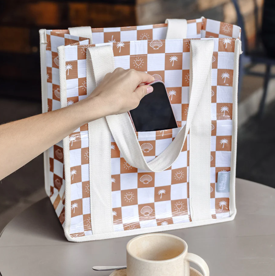 Our on-trend neutral Icons print is the queen of 'goes-with-everything and anything' bag. Upgrade your boring shopping bags with an on trend checkerboard print.