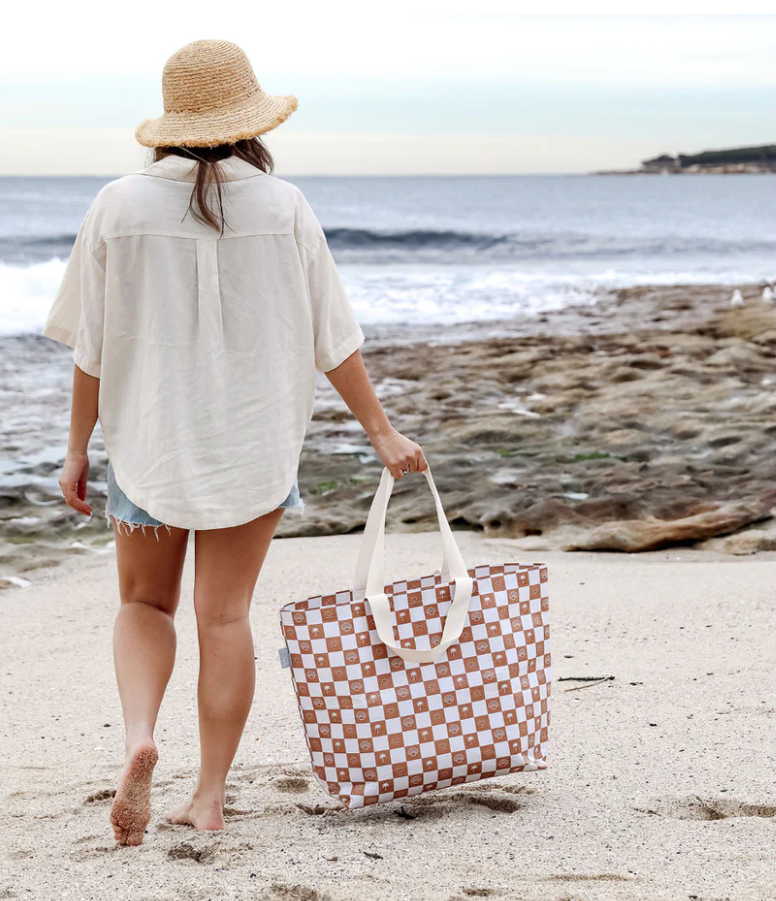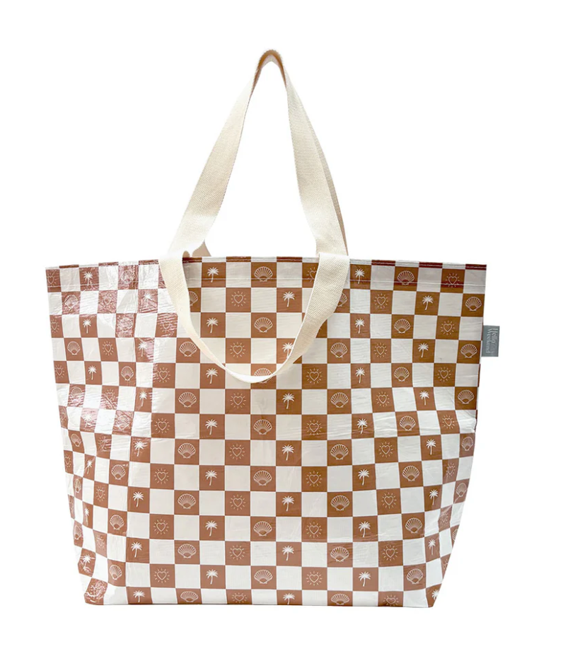 NEW for 2024! Introducing 'Icons' - a classic with a rad set of icons that combines a checkerboard print in an earthy bronze colour tone. Palm tree, shell and a love heart sun - cool coastal vibes of style and sustainability.