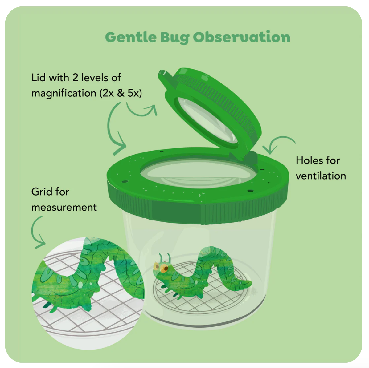 Designed to safely catch and release garden creepy crawlies. With two levels of magnification in the lid (2x and 5x) and a scale grid in the bottom of the container enables accurate measurement. Ventilation holes around the lid make sure bugs can breathe. Includes guided activity book is filled with bug tips and activities.