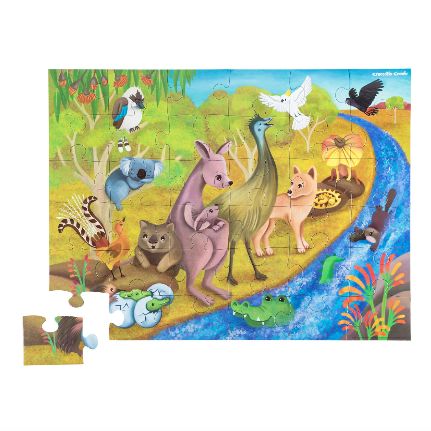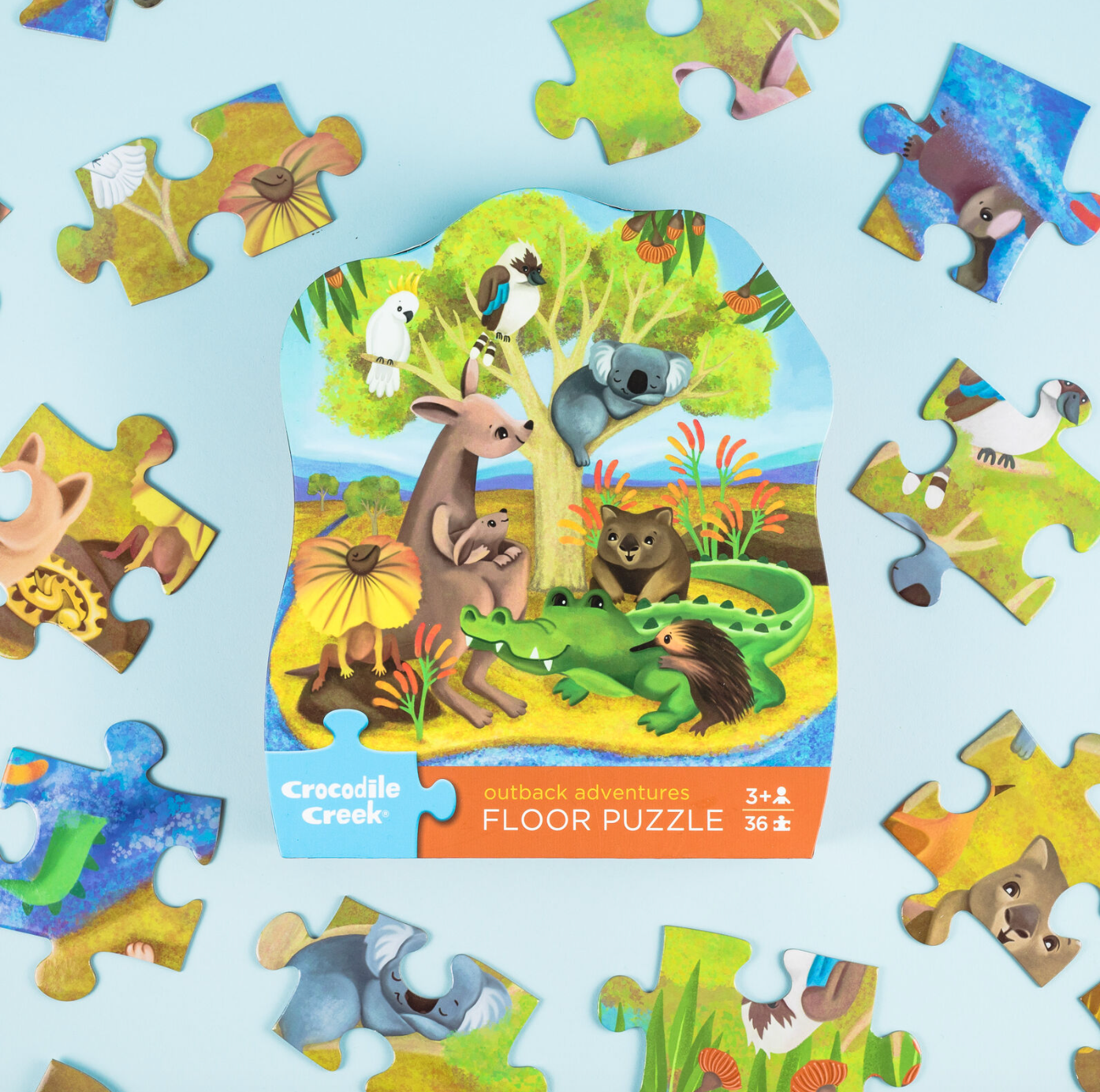 Take an outback adventure with this beautifully illustrated 36-piece floor puzzle. All wrapped up in its unique contour-shaped storage box, the jumbo, sturdy pieces of this high-quality puzzle are ideal for little hands.