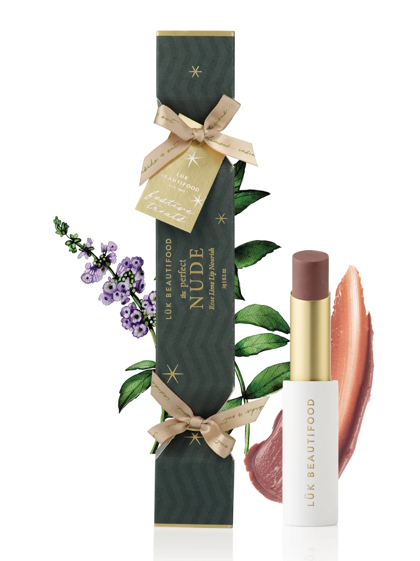 Our best-selling Australian made natural nude Lip Nourish™, Rose Lime, beautifully presented in a festive Bon Bon. The ultimate holiday stocking stuffer or charming table decoration, complete with gift tag — ready to delight.