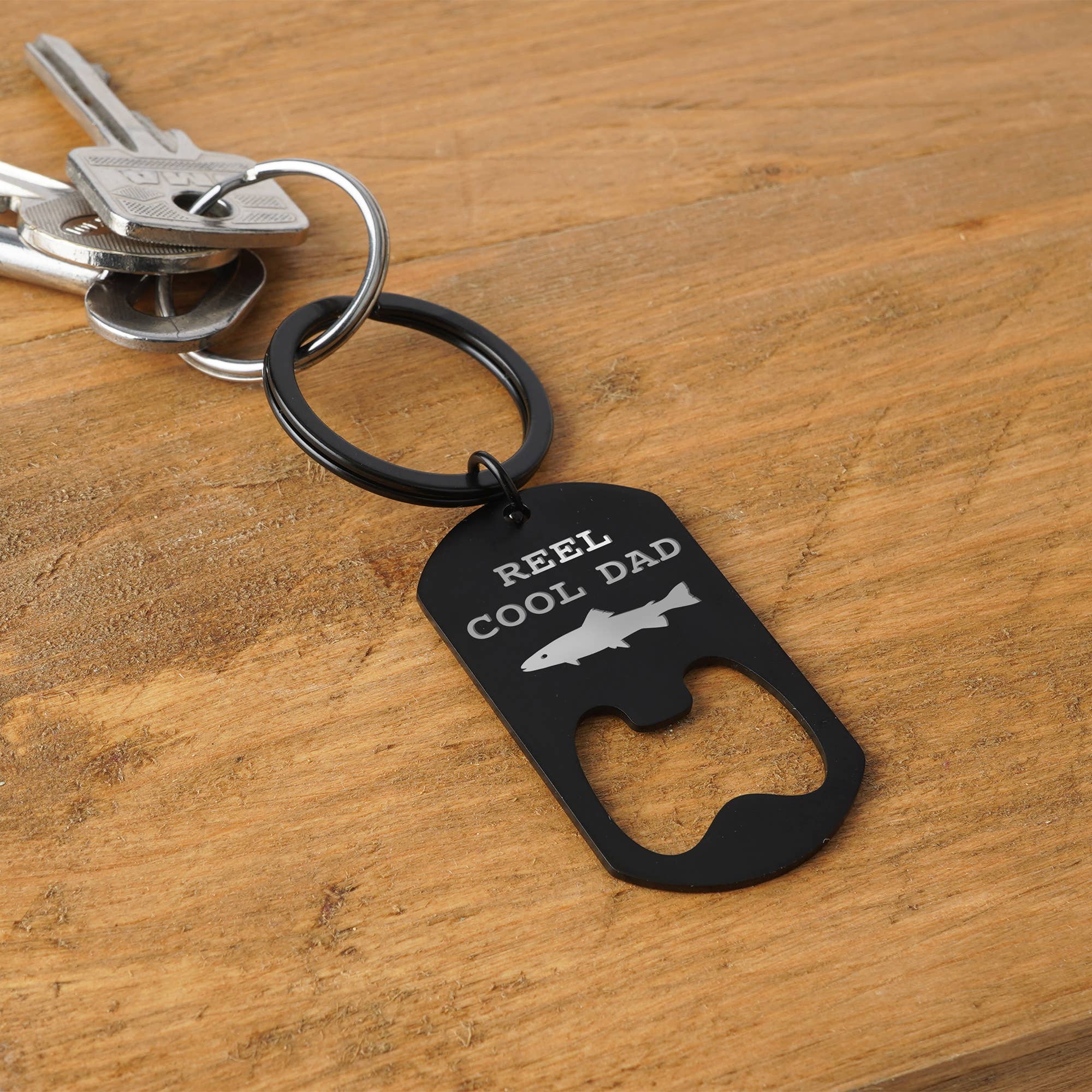 Made from premium black metal, this durable keyring features a fun fish illustration alongside the playful engraved slogan: "Reel Cool Dad."