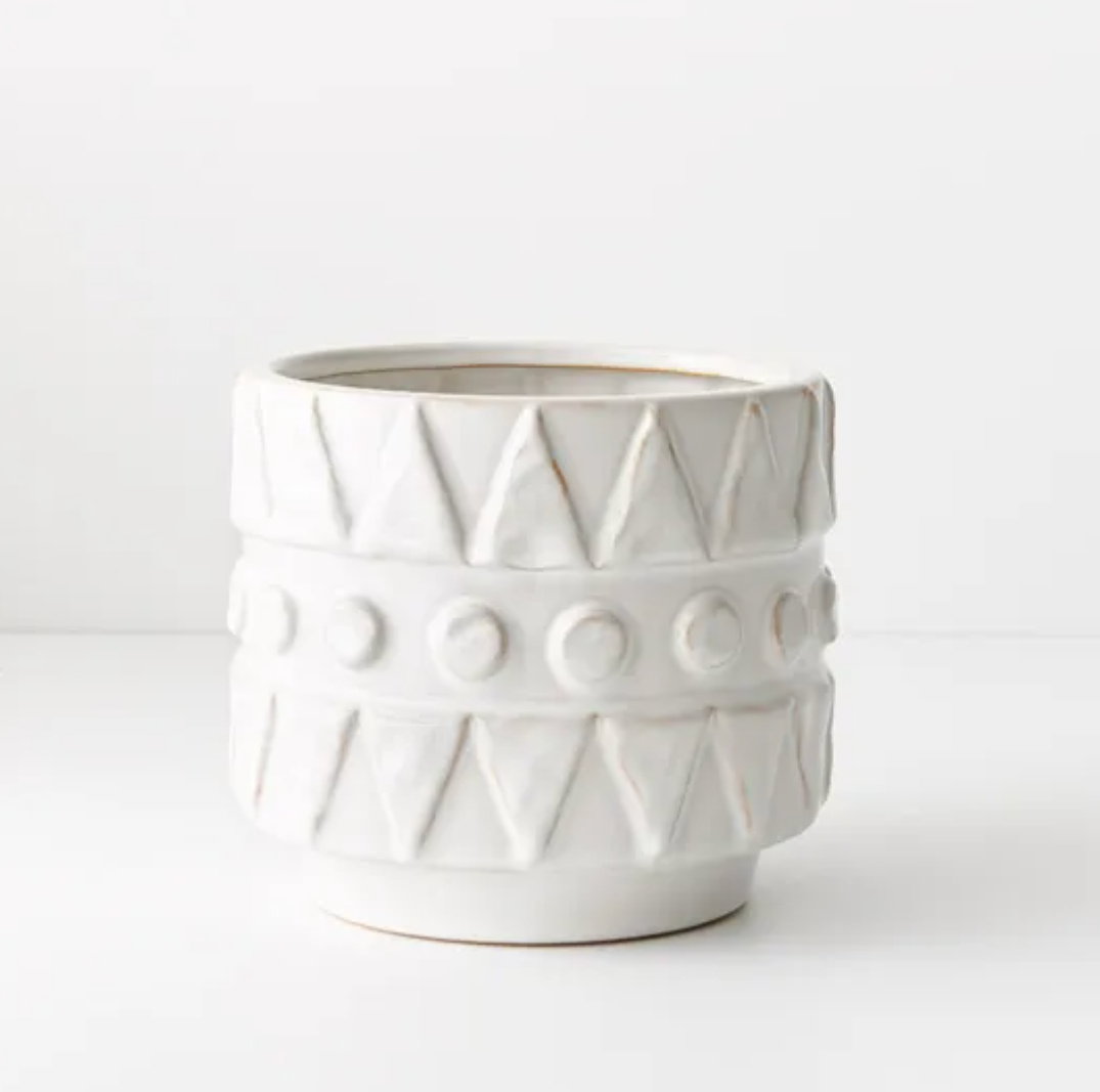 The Jadelo Pot, adorned in crisp white finish, showcases captivating geometric patterns. Its intricate design adds depth and character to any space, making it a stylish vessel for plants or a standalone decorative piece, infusing interiors with modern elegance and charm.