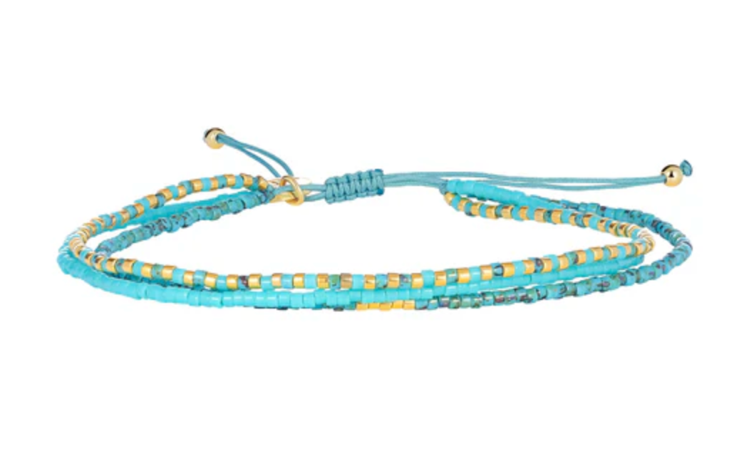 Triple strand Miyuki bead friendship bracelet in aqua and gold. Measures 17 cm
