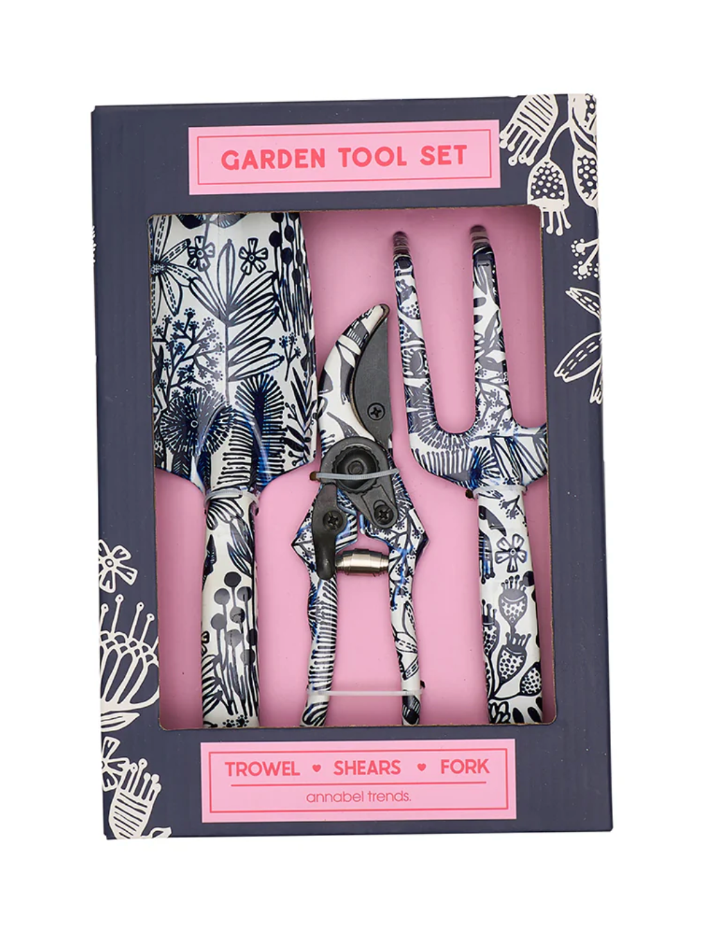 Transform your gardening experience with stunning tools featuring exquisite designs. These three-piece sets will inspire any gardener, includes pruning shears, fork and trowel. Available in colourful new season designs. Gift boxed for easy gift giving. Match back with our patterned kneeling mats, garden gloves and tool belts. Boxed size: 21cm x 27.5cm x 4cm