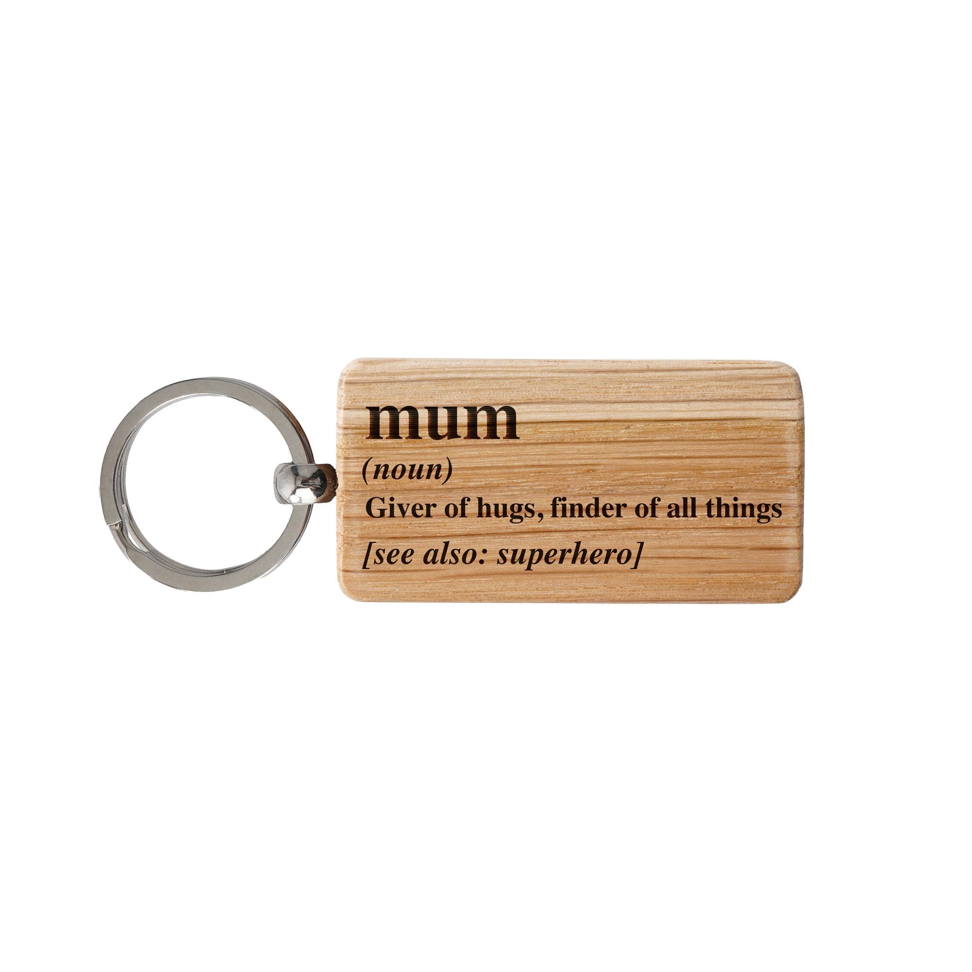 Emblazoned with the lighthearted slogan "Mum - Giver Of Hugs, Finder OF All things" this keyring celebrates the delightful blend of mum and superhero that makes every mother special. The words are intricately engraved into the wood, creating a lasting and endearing tribute to the playful side of motherhood..