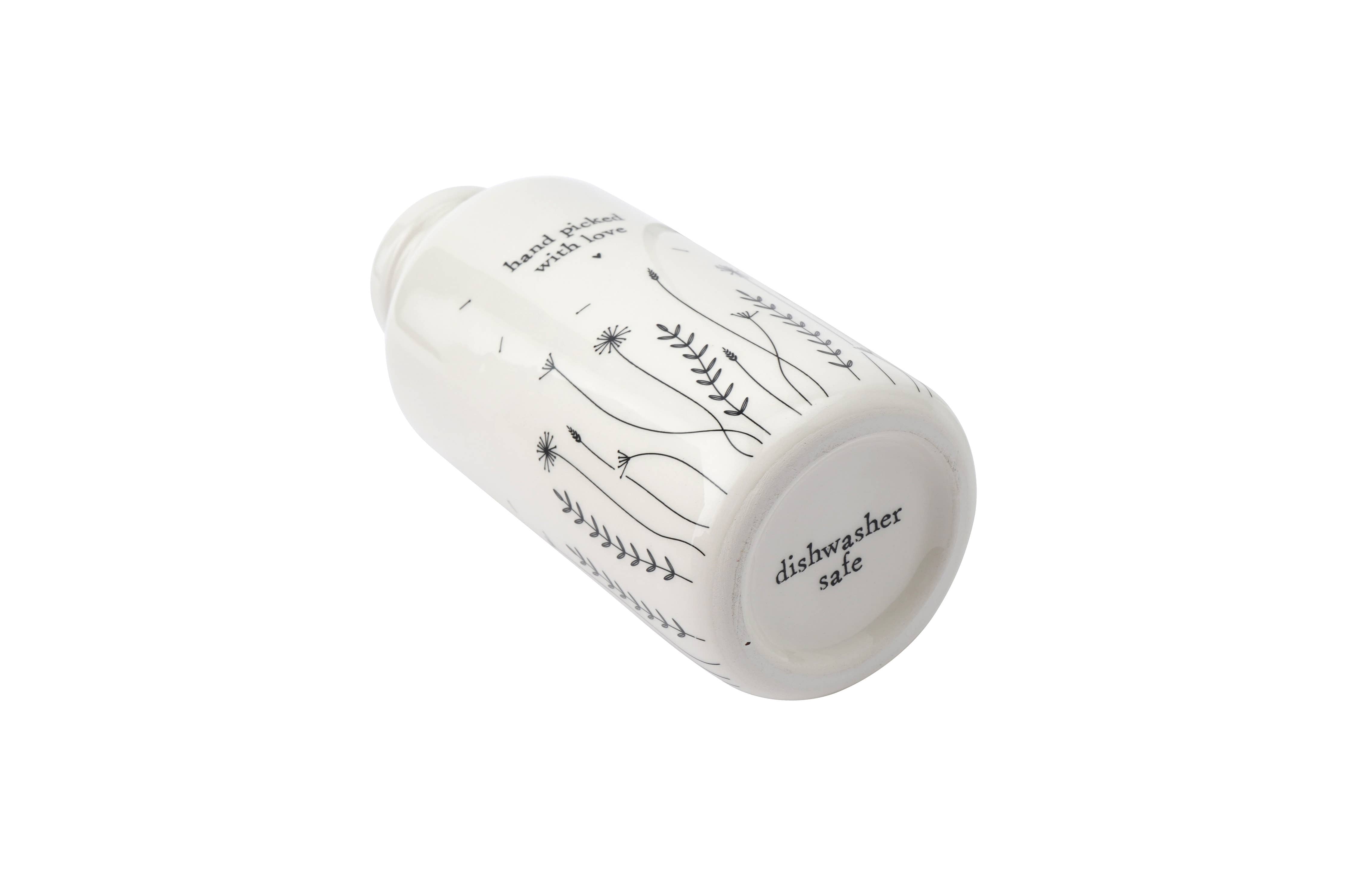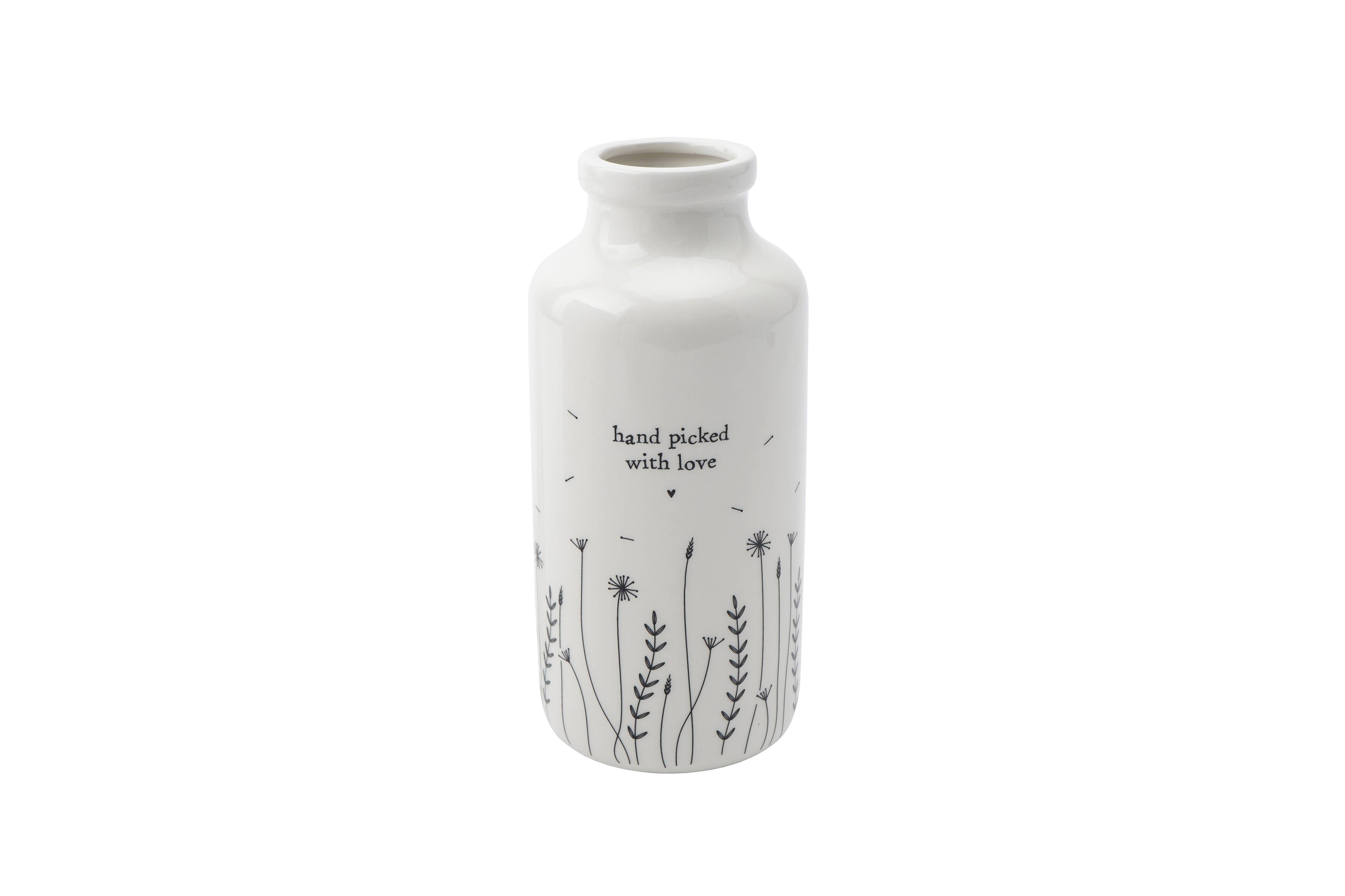 The delicate floral design, handcrafted onto the ceramic surface, breathes life into this charming bud vase. Complemented by the heartfelt slogan, "Hand Picked With Love" this vase becomes a thoughtful and sentimental gift for cherished friends.