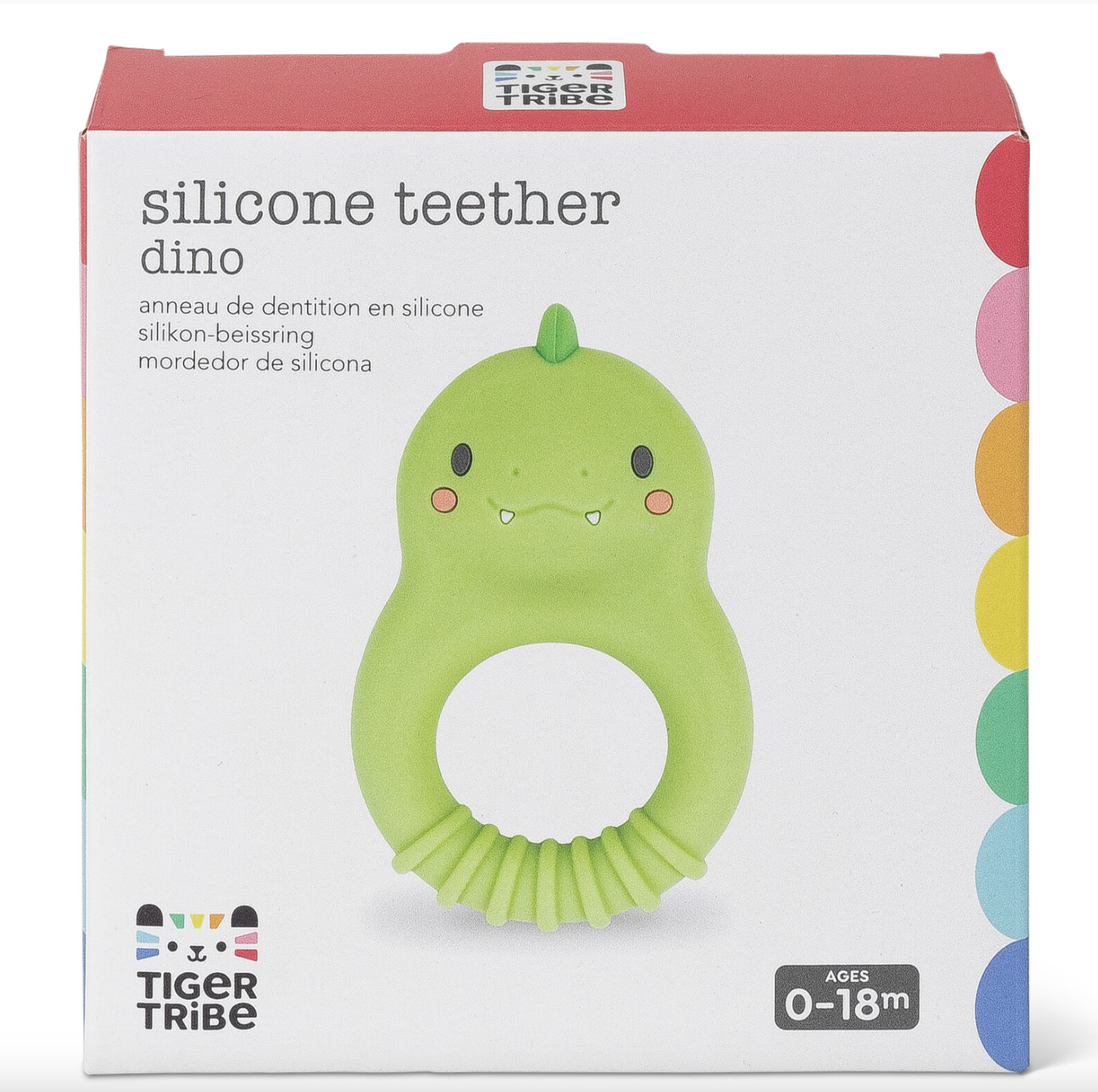 Made of soft, food-grade silicone, this textured Dino teether is designed to soothe and comfort teething babes.