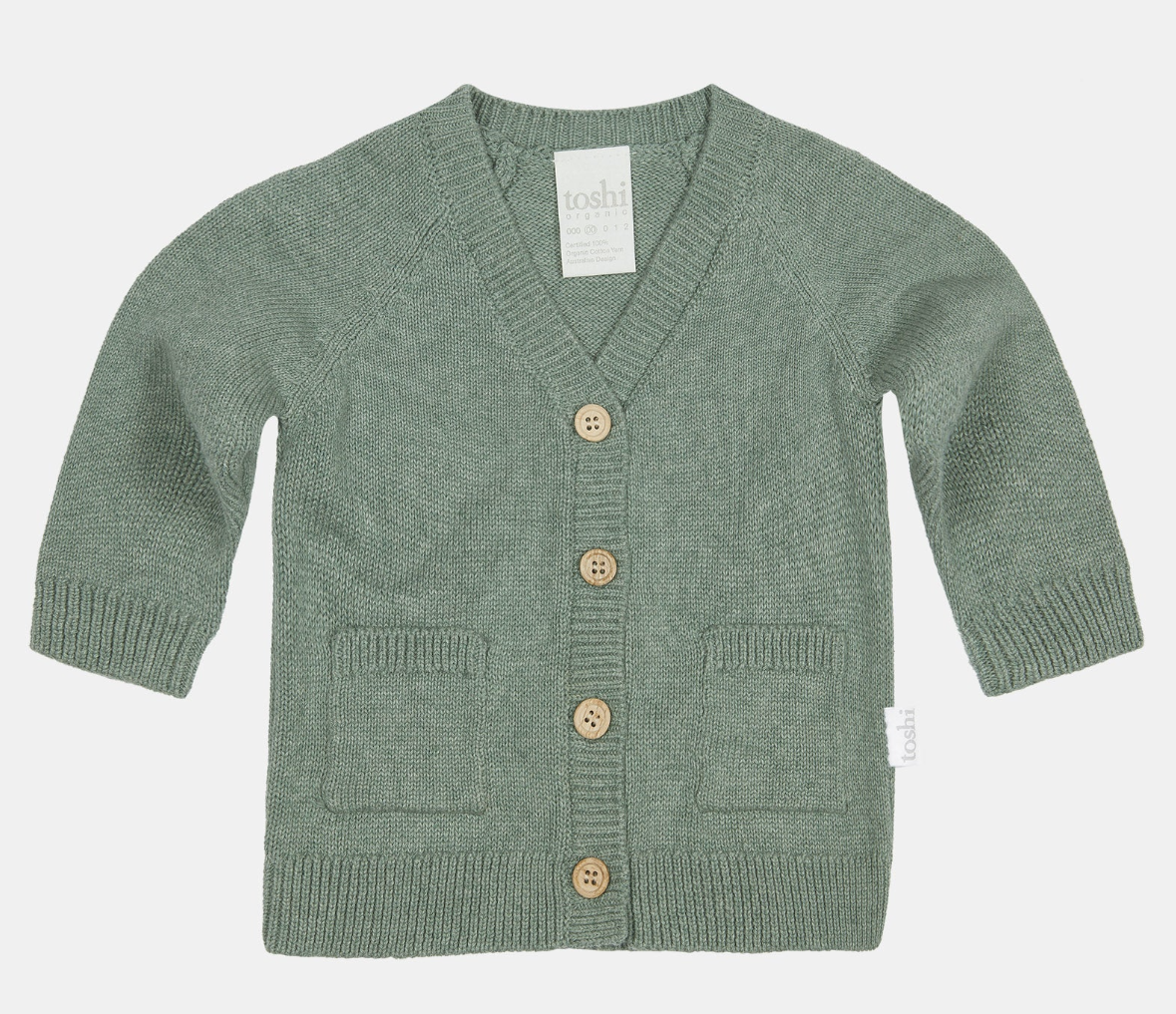 The sumptuously soft Toshi Organic Baby Cardigan Remy is crafted from the finest quality certified 100% organic cotton yarn. Organic certification ensures the cardigan is gentle on your delicate baby, as well as our precious environment. A melange yarn offers a level of refinement to this cosy and nurturing Toshi baby accessory. The styling is relaxed and loose fitting and creates a classic and yet contemporary feel. Traditional wooden buttons and functional pockets are featured. Cardigan Remy is designed to keep precious babies warm and cosy during our cooler months.