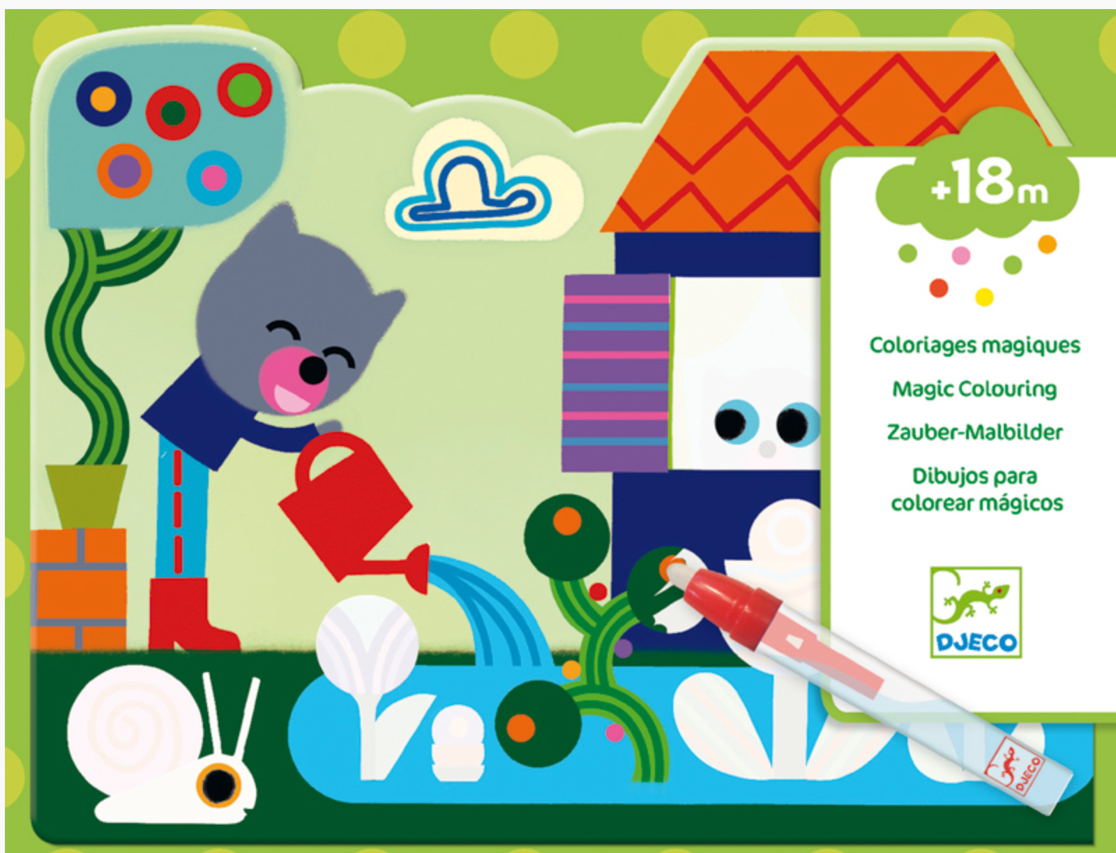 A water-based colouring set specially designed for little ones aged 18 months and over. Children use the water-filled pen to colour in the white areas and discover what is hiding. It's magic as the patterns appear! Once the pages are dry, the fun starts all over again! Plastic boards to colour again and again. Handy storage set that is easily portable.