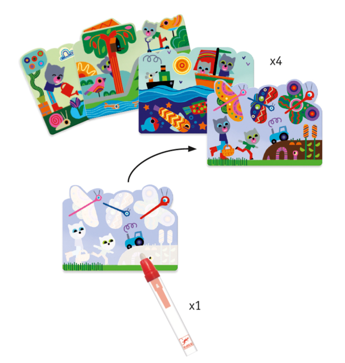 Contents: 4 illustrated boards in flexible plastic with a white area that disappears, a pencil with a water tank and 1 thick cardboard stand.