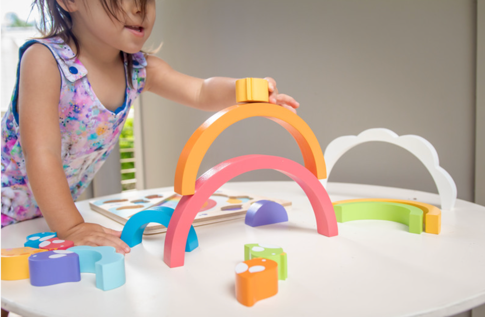 • Making a rainbow.  Once the colours are learnt children can follow on with the introduction of the concept of smallest to largest or largest down to smallest. Pick and place the smallest piece of the rainbow.  Which piece comes next? Or pick and place the largest piece of the rainbow etc.