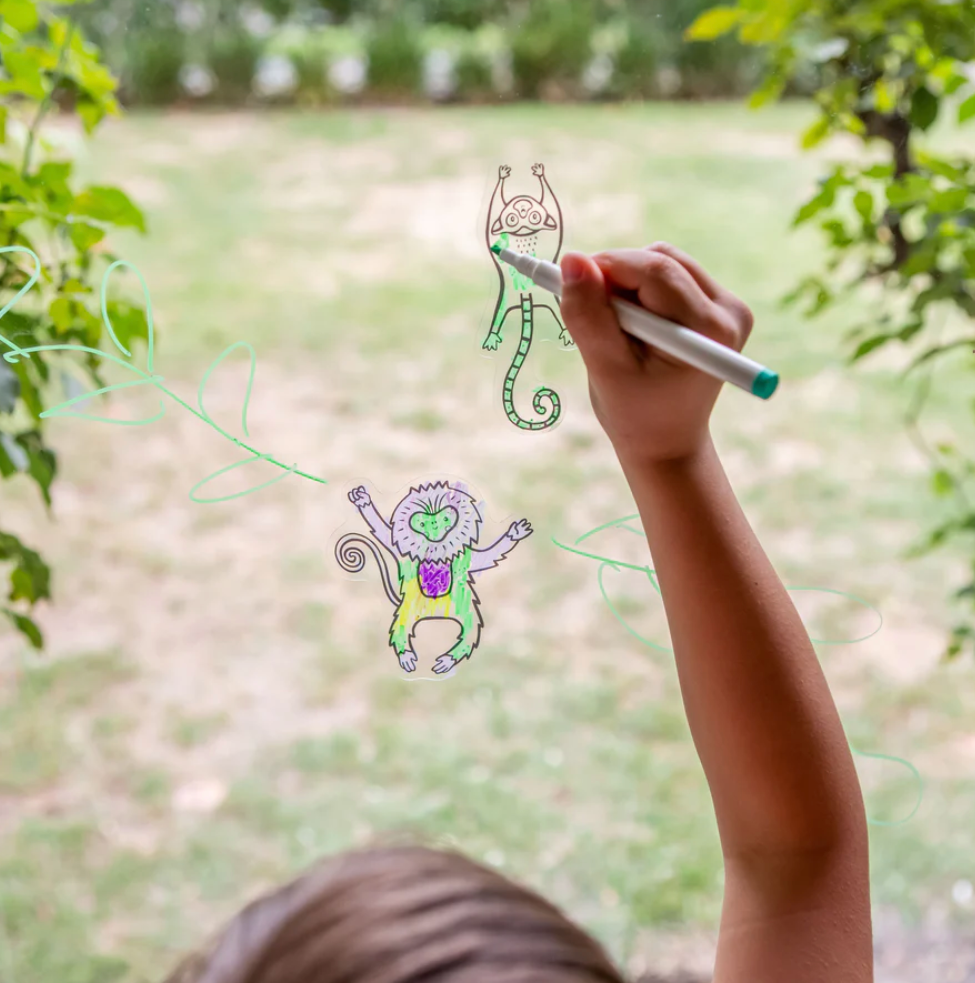Colour-in lemurs, armadillos and toucans with the vibrantly coloured window markers, then stick the Movable pieces to the window (or any smooth surface including glass, tiles and fridges) and look out for the whimsical, colourful effect when the light hits the window! Extend the play-value by learning how to draw directly on the window using the included guide.