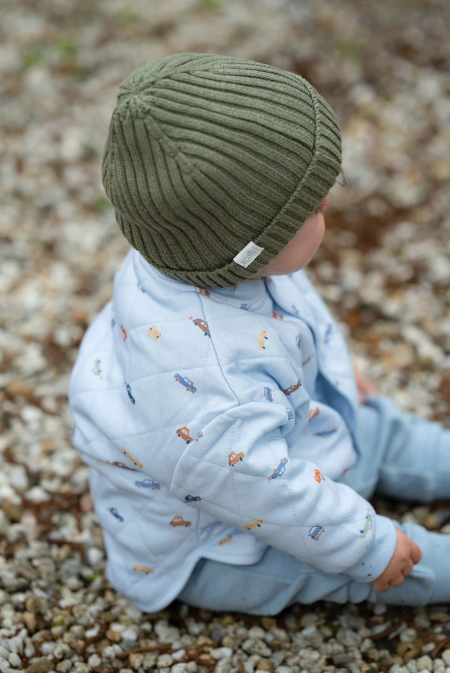 Toshi Beanie Tommy is crafted from the finest quality certified 100% organic cotton yarn. Organic certification ensures the beanie is gentle on delicate heads, as well as our precious environment. The beautifully textured melange yarn brings an element of refinement to this beanie. The Toshi beanie features a classic fine ribbed knit design and a roll up border for versatility of styling. Beanie Tommy is fully lined for enhanced comfort and greater protection from the elements during our cooler months. With a traditional and timeless feel, Beanie Tommy is an ideal winter accessory for all ages and sizes. This beanie colour is Storm, a gentle blue hue. Style Beanie Tommy with Toshi Cardigan Andy and Booties Marley for a nurturing and cosy winter feel.