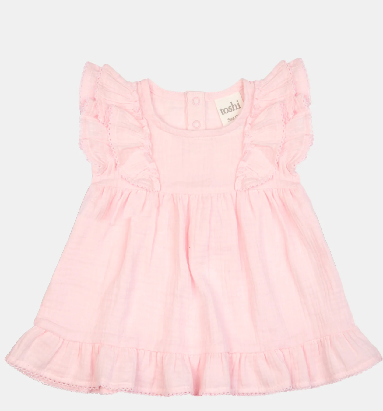 Toshi Baby Dress Sammy is crafted from the finest quality certified 100% organic cotton yarn. The cheesecloth fabrication features a supremely soft and gently nurturing texture. The classic colours create wardrobe staples, and are ideal for layering and transeasonal styling. The A-line shape is flattering and comfortable, with space for freedom of movement. Feature frill creates a playful and charming touch. The dress has back press studs for convenient dressing. The beautiful Toshi Baby Dress transitions effortlessly from casual occasions to special celebrations.