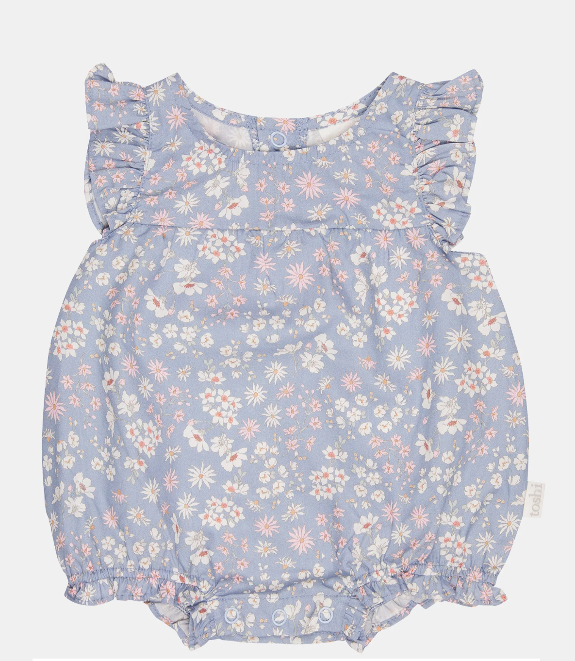 The Toshi Baby Romper is reminiscent of bygone eras and is the perfect outfit for fun baby play. Flattering frills create a pretty, feminine and playful style. The covered back and shoulders offers greater comfort. Elasticised leg openings offer enhance flexibility for a snug fit. Press studs create convenient nappy changes. The Toshi Romper is ideal for everyday play and special occasions.