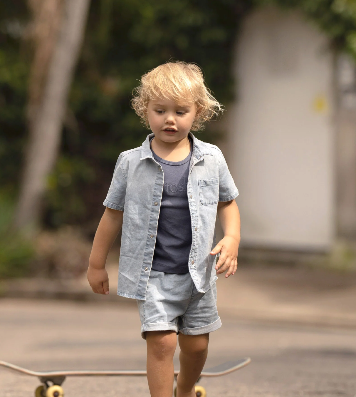 Toshi Shirt Classic Indiana is crafted from the finest quality cotton, artisan washed, distressed denim. The short sleeves and collar create a relaxed and casual styling. Subtly Toshi branded, front opening press studs for ease of dressing. A functioning pocket is included for practicality. Toshi Shirt Classic Indiana is a versatile wardrobe essential and transitions effortlessly from play dates to special occasions.