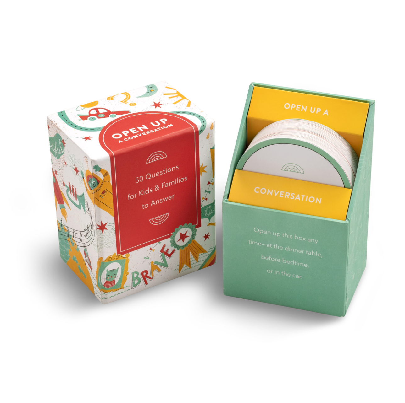 Inside this box are 50 conversation starters — questions you can ask at the dinner table, before bedtime, or in the car.