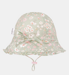 Toshi Bell Hat Eva is a flattering and feminine bell shaped hat. A UPF 50 + UV rating is provided in colourway Dusk. The baby sunhat is crafted from the finest quality 100% cotton. The head tie offers adjustable sizing and a chin tie secures the hat. The sunhat is fully lined for increased comfort. Pretty styling is created with a softly frilled border.