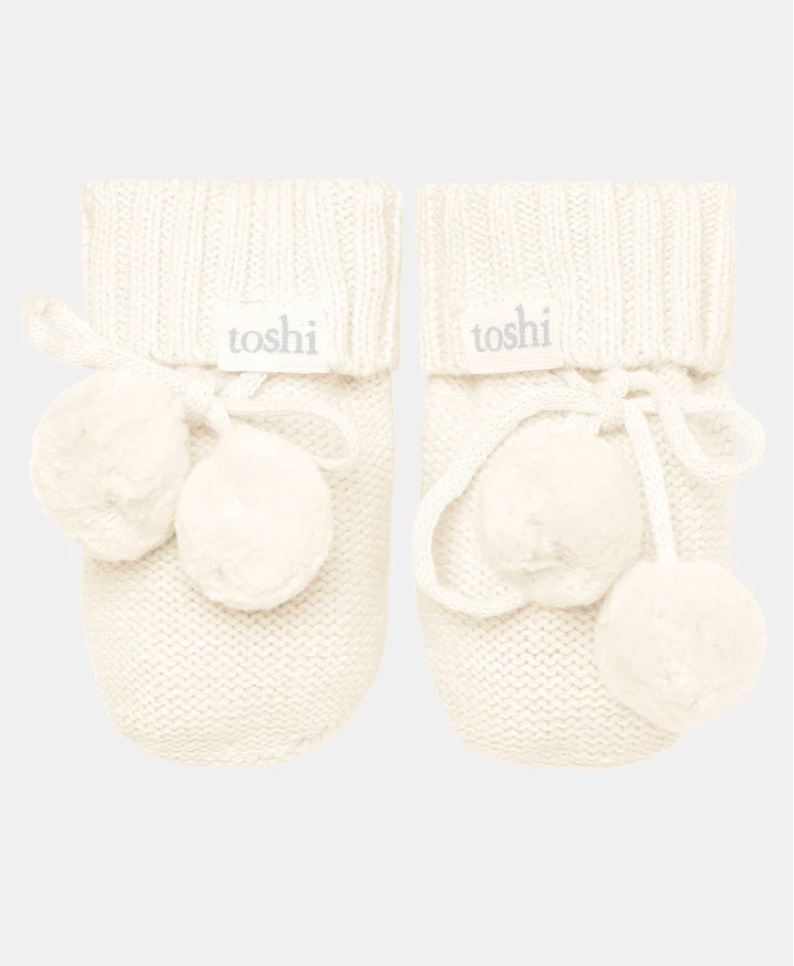 The much loved Toshi Organic Baby Booties Marley are made from the finest quality certified 100% organic cotton yarn. Organic certification ensures the booties are gentle on your babies delicate feet, as well as the environment. The beautifully-textured melange yarn brings an element of refinement to this Toshi baby accessory. Carefully crafted with a ribbed knit cuff, Toshi booties stay up while gently contouring the wearer. Our booties are ankle height and are designed to protect precious tootsies during rest and play. Cute pom poms create a whimsical style and the ties ensure a snug fit. Toshi booties are packaged in a quality box and make an ideal newborn gift.
